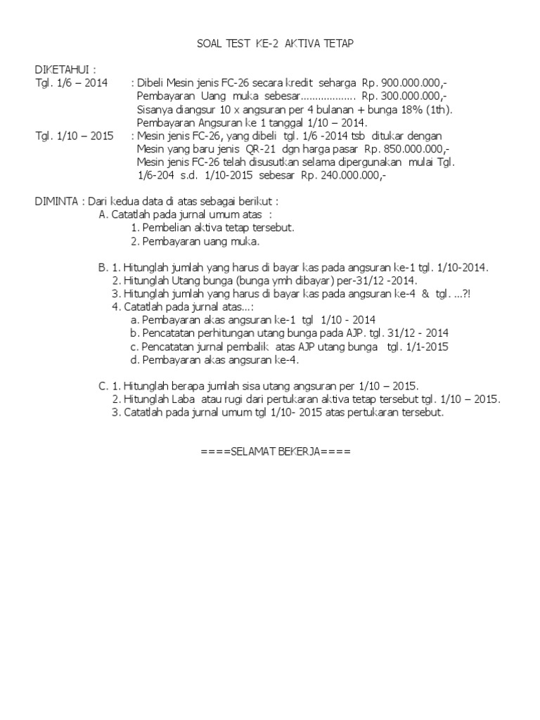 Soal aktiva tetap dan jawabannya ilmusosial id Contoh soal dan jawaban aktiva tetap doc barisan contoh. Pengertian aktiva tetap sejenis adalah metode pengkategorian harta perusahaan dalam rangka menentukan masa manfaat atas penggunaannya. Dapat dilihat formulasi aktiva tetap berdasarkan psak 16 yang berlaku di indonesia, aturan pajak, dan juga kondisi yang ada pada perusahaan. Soal dan pembahasan bab aktiva tetap.