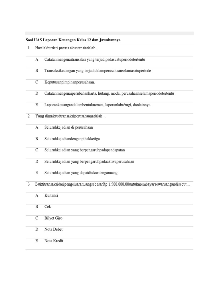 Dalam bentuk dokumen apa biasanya halaman web mengirimkan kembali hasilnya. Soal uas akuntansi keuangan kelas 11 dan jawabannya. Berikut saya buatkan rangkuman soal dan jawaban ulangan asj untuk kelas 11. Soal essay administrasi perkantoran kelas 12. Soal dan jawaban kewirausahaan kelas 12.