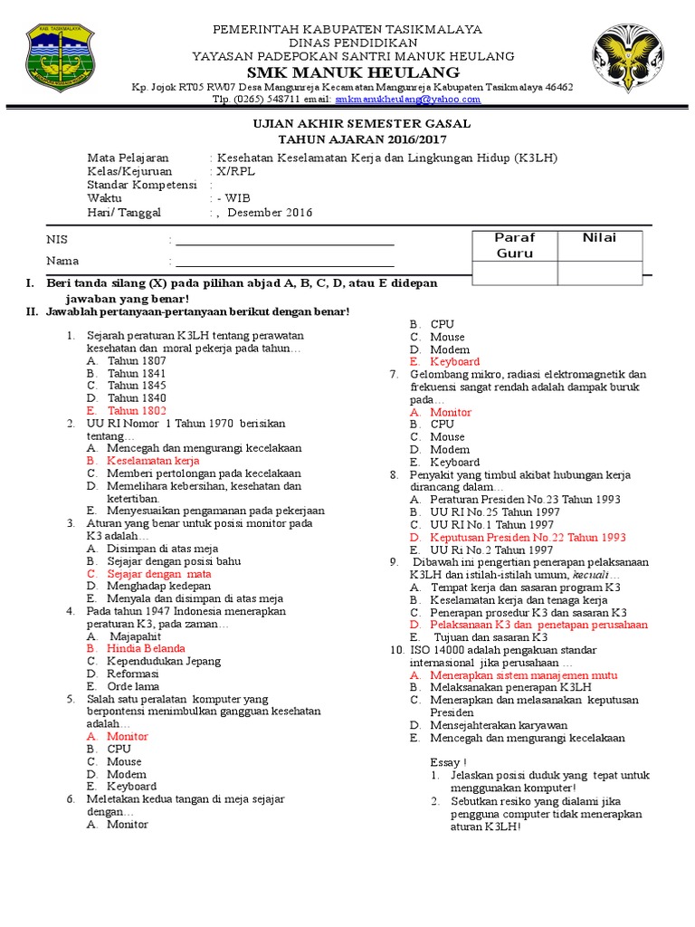 Praktek keselamatan dan kesehatan kerja. Soal uas prakarya dan kewirausahaan smasmk kelas x xi xii semester 1 20172018 ini merupakan soal terbaru yang akan saya bagikan untuk referensi membuat soal uas mata pelajaran prakarya dan kewirausahaan jenjang smasmkma. Soal + jawaban pilihan ganda k3lh kelas 10 1. Soal k3lh uts kelas xi pada kesempatan kali ini saya hanya … contoh soal dan jawaban tentang k3lh. Soal dan jawaban kwu kelas xii.